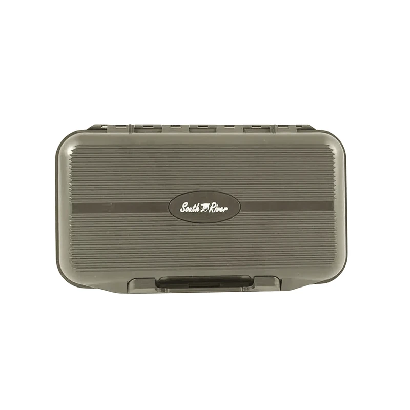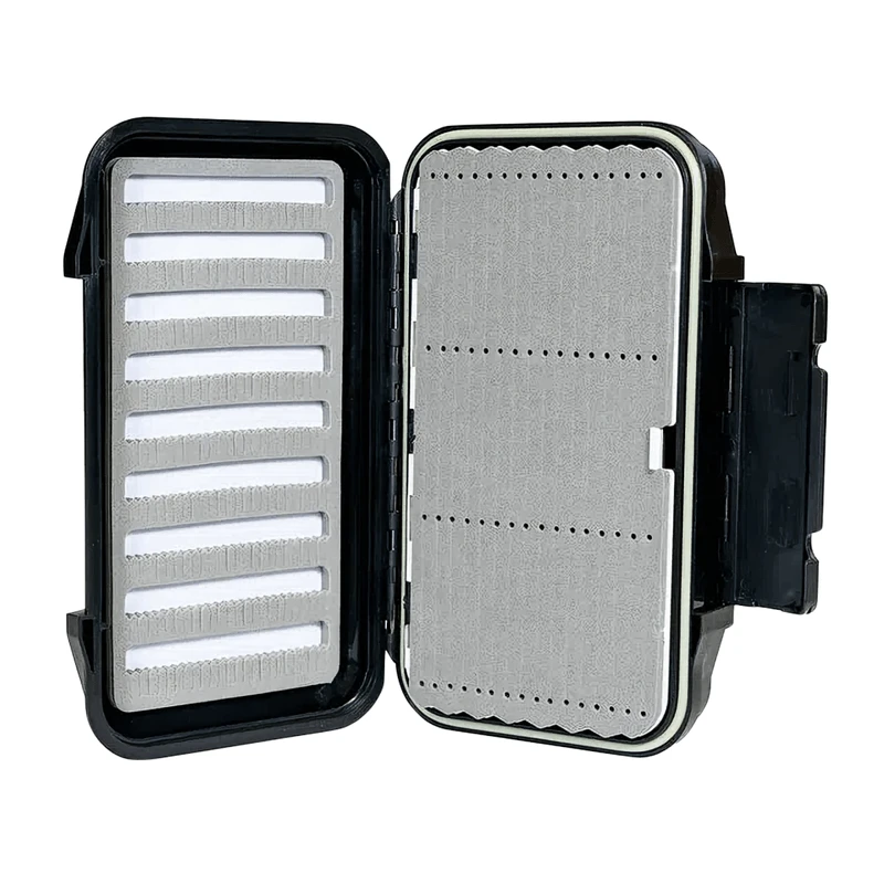 Stores dropper rigs, large streamers, dries, and nymphs in a single water resistant box. This versatile fly box features a unique swing leaf designed to store 7 of your pre-tied dropper rigs. The bottom of the box is extra deep with streamer foam for larger flies while the shallower lid has sawtooth foam for nymphs and smaller flies. This box seals tight with a water resistant gasket and secure easy opening latch.